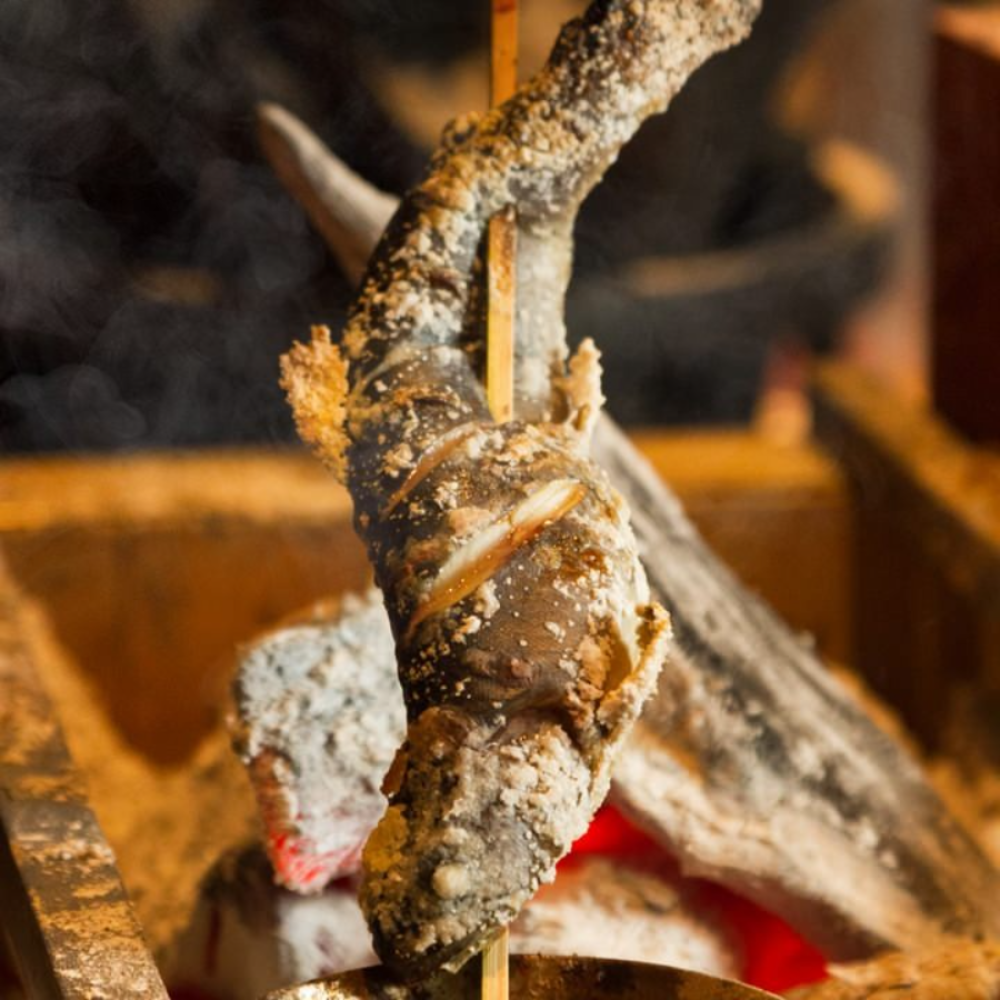 ◆信州サーモンとシナノユキマスの二種盛り ◆鯰と季節野菜の天ぷら ◆和牛炙りすき ◆薪かまど炊きご飯 ◆手搾りレモンのシャーベット